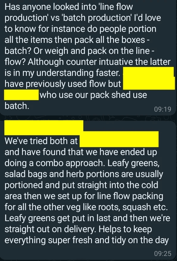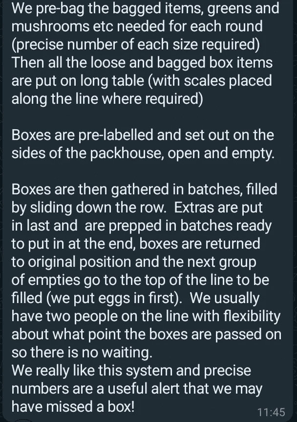 Recently some of these box scheme operators were discussing box packing techniques online, to share their thoughts about the quickest and most efficient way to get the veg in the boxes and onto their vans.